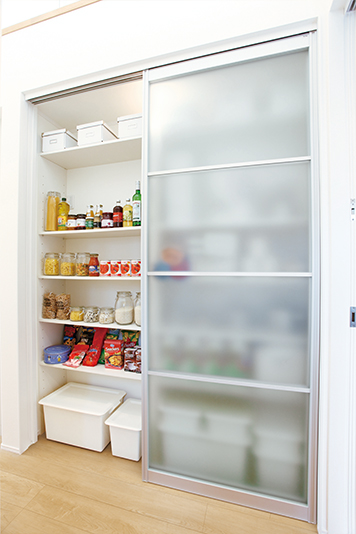 たっぷりと収納できる大容量パントリー。来客時に見られたくないものを一時的に隠せる扉付きです。