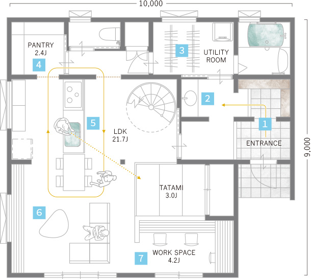 汚れた服や靴下は玄関から直接洗面所の洗濯機へ。リビングを通らず、汚れを部屋に持ち込まない安心の動線です。