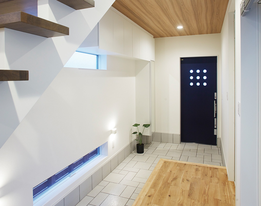 大好きな木目調にこだわり抜いたというKさん。室内は、木の風合いを感じる無垢の床材に、奥様の好きなブルーの壁紙がパキッと映えるおしゃれな空間です。「絶対に取り入れたかったのは、風通しのよさと明るさ。2階の光が1階に届くよう、中庭上のバルコニーの床材をグレーチング※に。風が入るよう、間取りもコの字型へと工夫しました」。ダイニングテーブルや飾り棚など、ご主人手づくりのインテリアもお住まいの雰囲気にマッチしています。ダイニングは、家族の目線が合うよう座卓にこだわり、小上がりにしました。子ども部屋を1階にしましたが、階をまたいでもお互いの気配が感じられるよう、リビング階段をオープンで開放感のあるデザインに。屋上から2階の様子が見える窓も取り付け、どこにいても家族のつながりを感じられる家になりました。